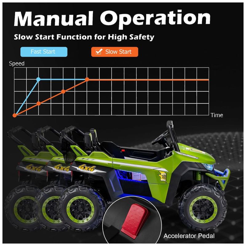 Para a segurança dos pequenos, o UTV oferece duas opções de velocidade, variando de 2 a 4 km/h, com uma função de partida suave que proporciona uma condução tranquila. A suspensão de mola nas 4 rodas garante uma viagem suave, absorvendo impactos e protegendo seus filhos. O carrinho possui dois modos de direção: as crianças podem dirigir usando o pedal, ou os pais podem controlar o veículo manualmente com um controle remoto de 2,4 GHz, oferecendo uma camada extra de segurança.