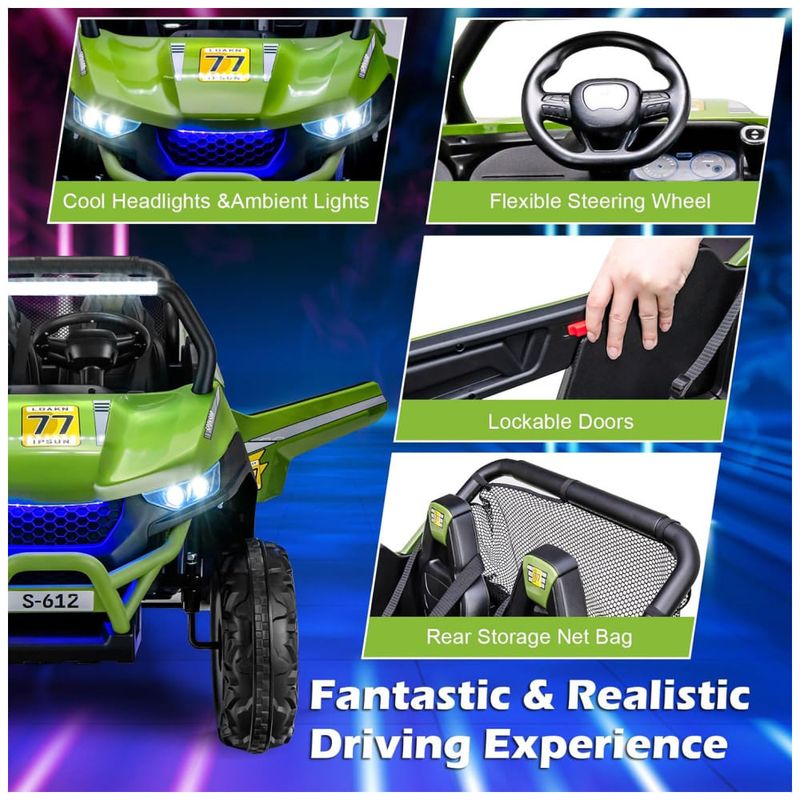 O UTV também inclui uma série de recursos de entretenimento, como música embutida, som real do motor e botões de buzina. Para tornar a condução ainda mais divertida, ele possui conectividade com USB, slot para MP3, FM e Bluetooth, permitindo que você toque as músicas favoritas das crianças durante a brincadeira.
