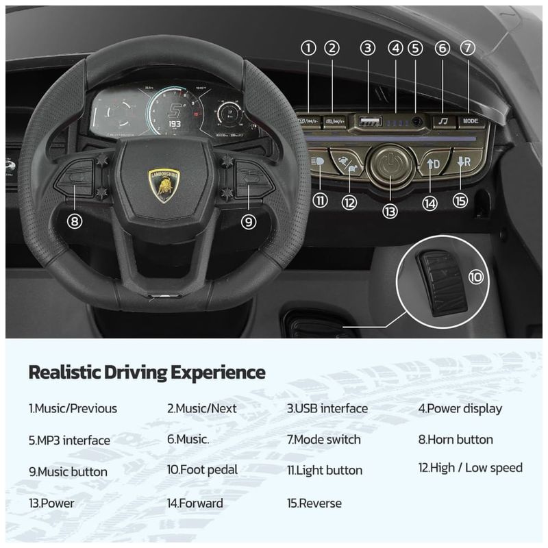 O Carro Elétrico Infantil EMARA 12V com Controle Remoto é uma incrível opção de presente para datas especiais como Natal, Halloween e aniversários. Licenciado pela Lamborghini, este carro esportivo combina um design elegante e aerodinâmico com detalhes autênticos dos verdadeiros Lamborghinis, como faróis de LED, um console de controle multifuncional, portas estilo tesoura e um tocador de música.