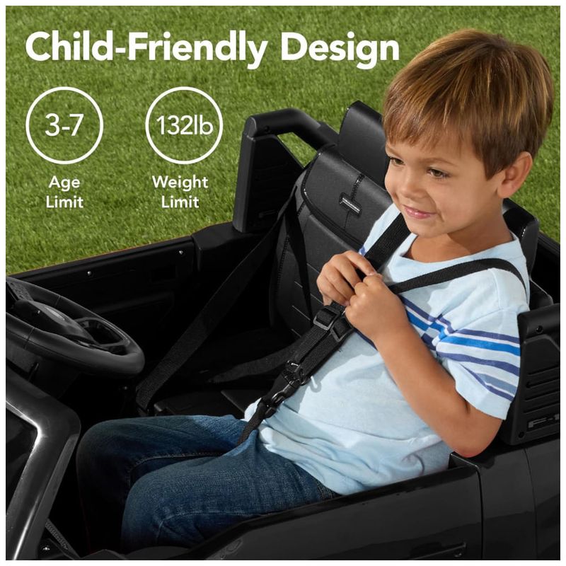 Projetado para acomodar confortavelmente dois passageiros, o veículo conta com cinto de segurança ajustável para manter as crianças protegidas durante o passeio. As rodas de plástico com sulcos proporcionam boa aderência, enquanto a suspensão nas quatro rodas oferece estabilidade e conforto. Para maior realismo, o carro possui faróis LED funcionais, ampliando a diversão em diferentes ambientes.