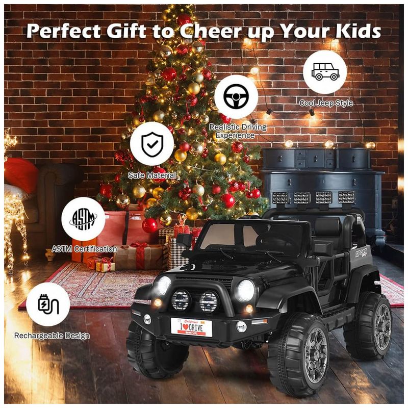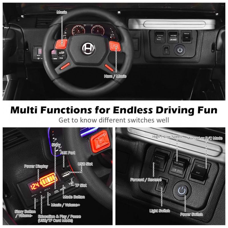 Caminhão de 2 lugares real Projetado com 2 lugares com cinto de segurança, este passeio de 12V em caminhão foi projetado para 2 crianças com 3 anos ou mais para brincar e aproveitar a emoção de dirigir juntas. E luzes LED, portas duplas magnéticas com trava, funções para frente e para trás e a função de ajuste de velocidade de três níveis proporcionam ao seu filho uma experiência real de direção.