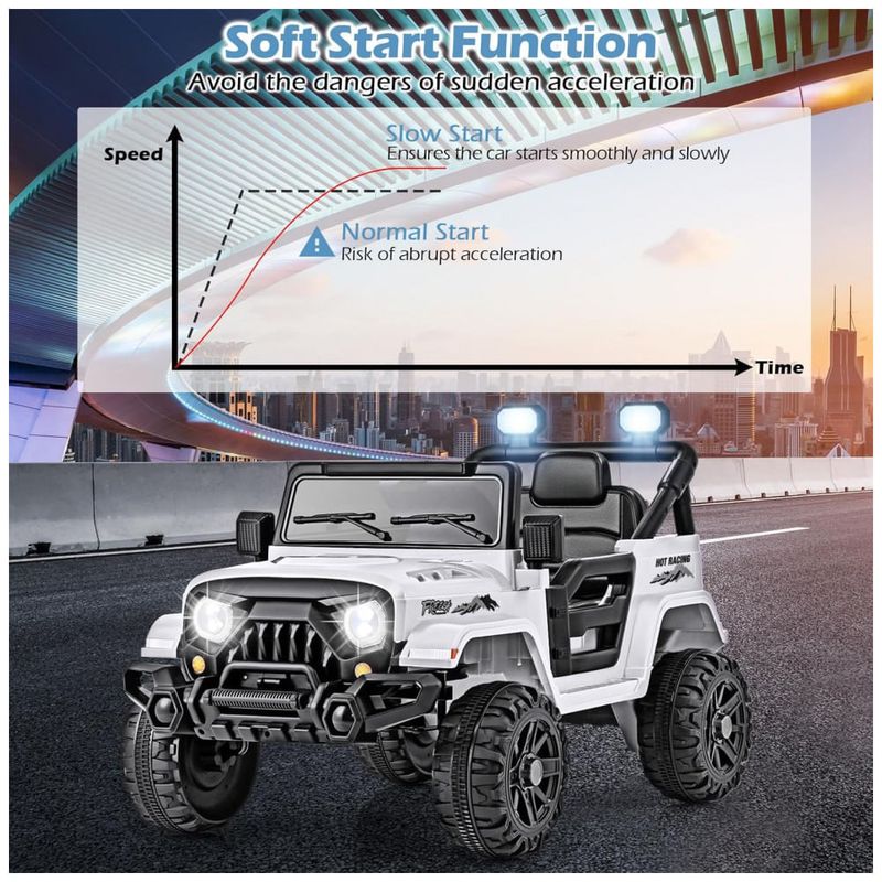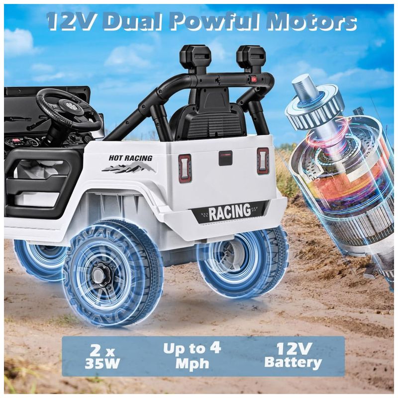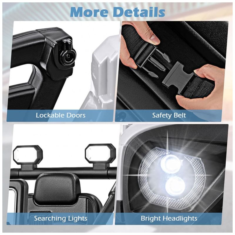 Recursos de segurança: Cinto de 2 pontos, portas com trava, partida suave, controle remoto parental