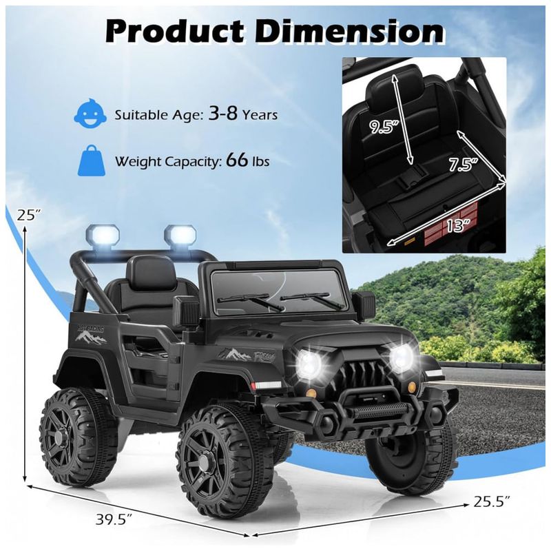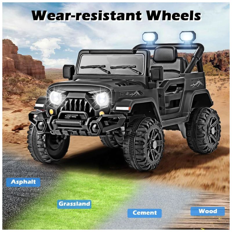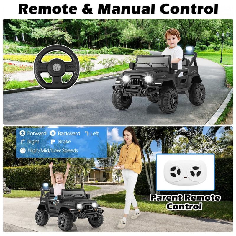 O modelo permite operação manual via volante e pedal ou controle parental remoto (2,4GHz), com função de frenagem de emergência e ajuste de três velocidades (até 6 km/h). Dispõe de portas duplas com trava, cinto de segurança, mola traseira para absorção de impactos e estrutura em polipropileno robusto.