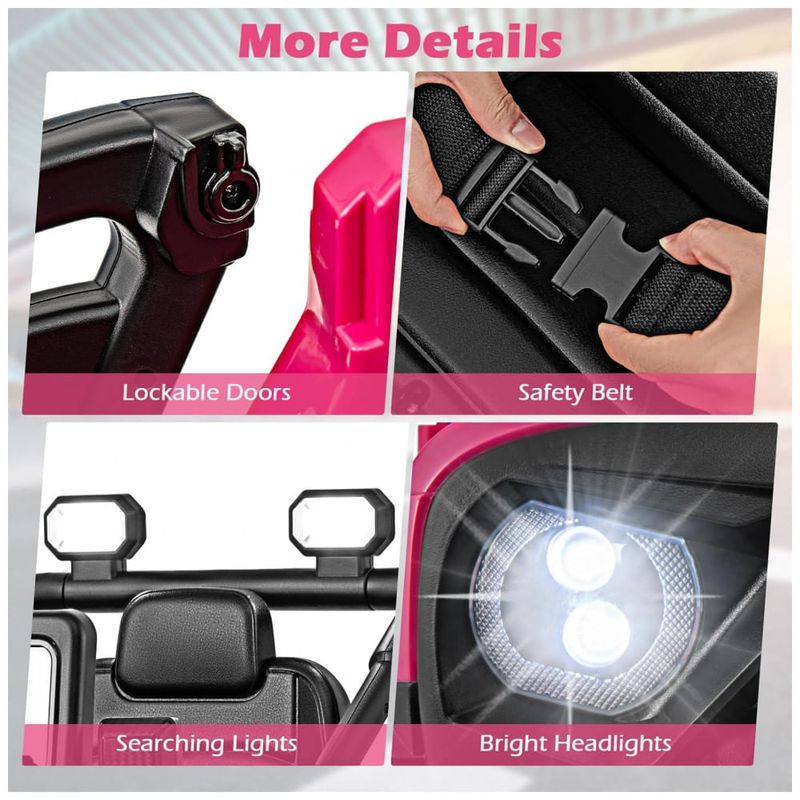 Recursos de segurança: Cinto de 2 pontos, portas com trava, partida suave, controle remoto parental