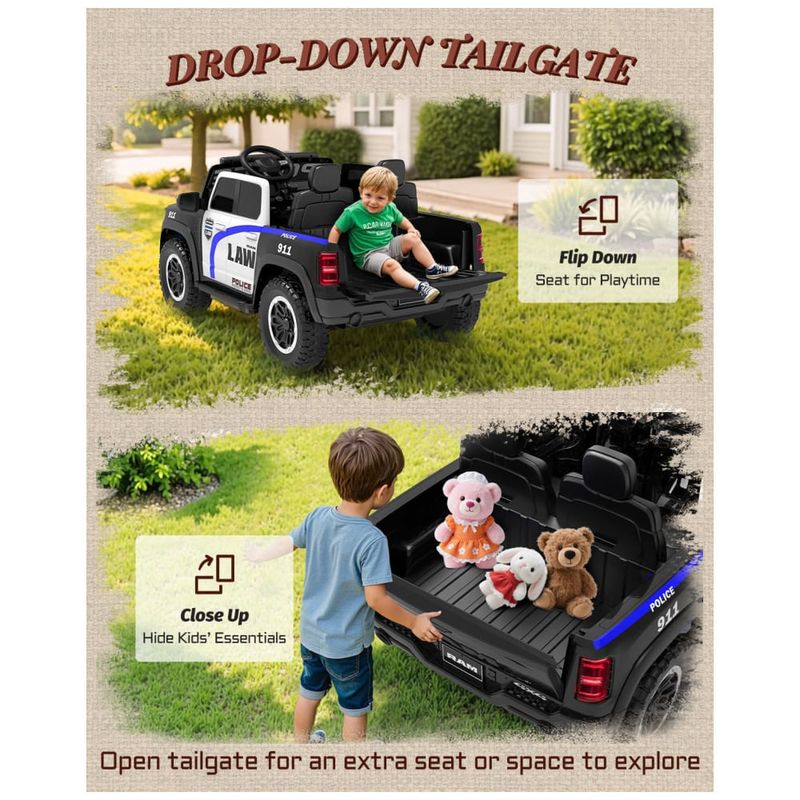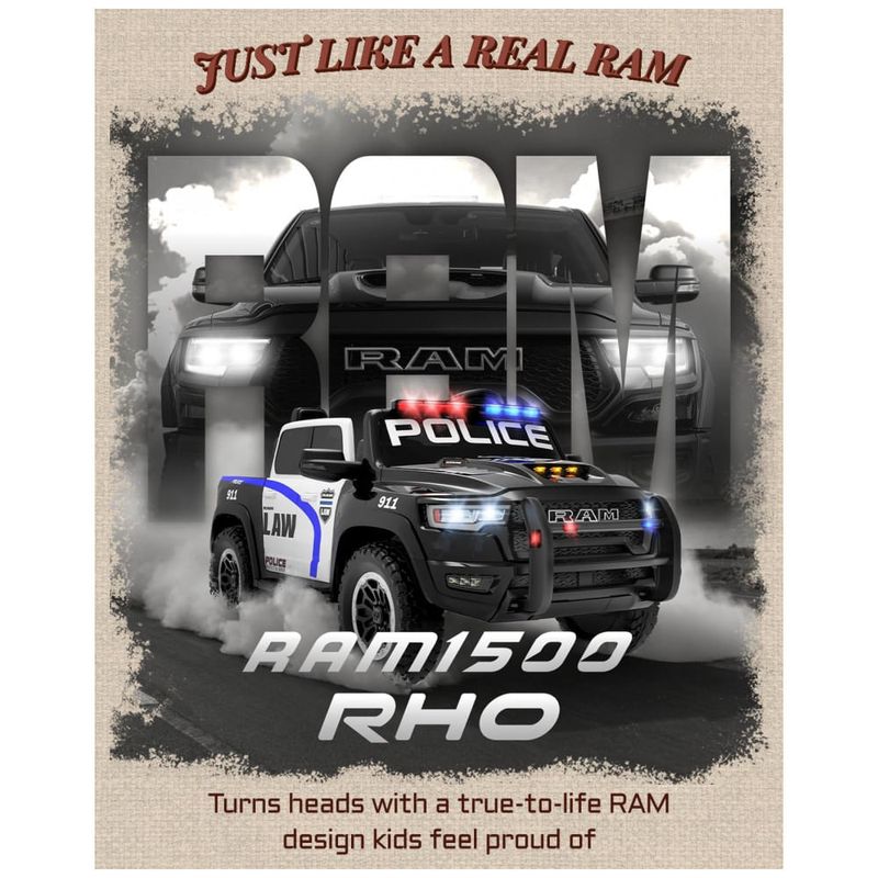 O Carro Elétrico Infantil Polícia RAM 1500 24V é uma réplica oficial do icônico caminhão RAM 1500 em estilo policial, equipado com luzes piscantes, sirene, megafone funcional e adesivos realistas para uma experiência de patrulha autêntica. Com Bluetooth, entradas AUX e USB, as crianças podem ouvir suas músicas favoritas durante a brincadeira.