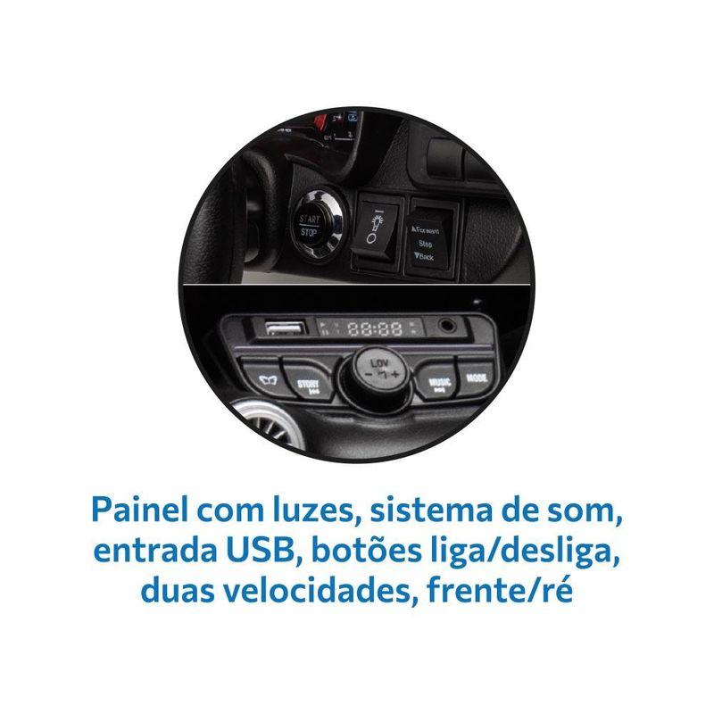 Entretenimento Integrado: Volante com buzina e seletor de música, entrada USB e Bluetooth para desfrutar de música durante o passeio.