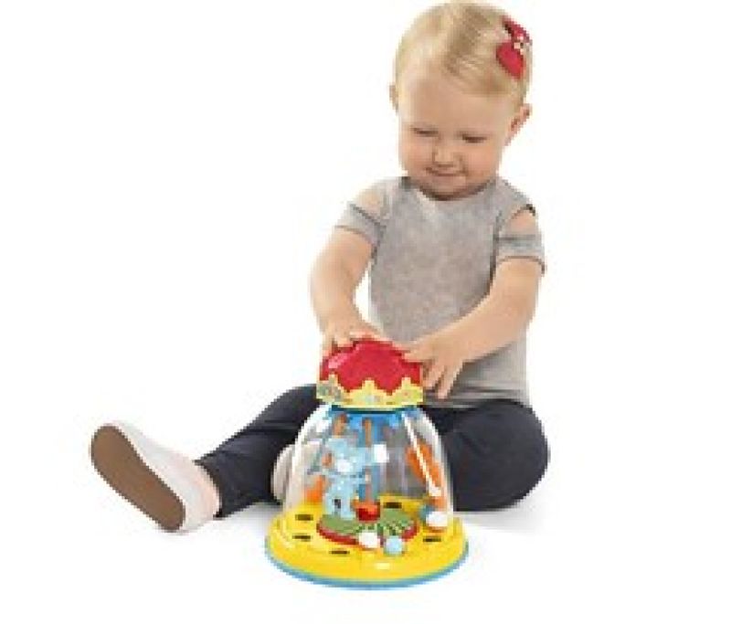 Enquanto o carrossel gira, as bolinhas saltam a base central se movimenta sob um efeito visual. Uma experiência visual que desperta e ajuda a desenvolver a capacidade cognitiva das crianças. Ao apertar o teto do carrosel, os bichinhos giram e as bolinhas pulam.