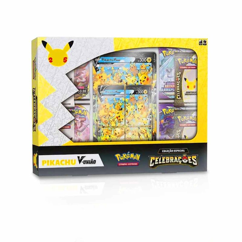 Esta coleção especial também conta com uma carta extragrande de Pikachu V-UNIÃO em uma única ilustração, além de pacotes de booster de Celebrações do Pokémon Estampas Ilustradas.
