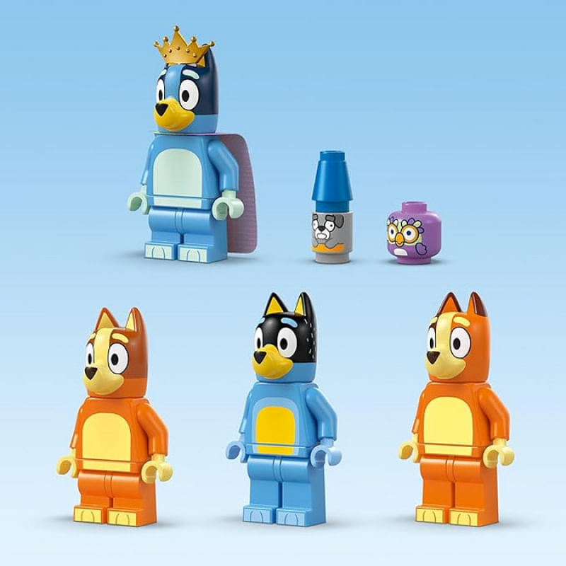 O conjunto inclui quatro minifiguras adoradas pelas crianças: Bluey, Bingo, Chilli (mamãe) e Bandit (papai). Entre os acessórios estão uma capa de arco-íris, varinha mágica e lupas, que tornam a brincadeira ainda mais divertida.