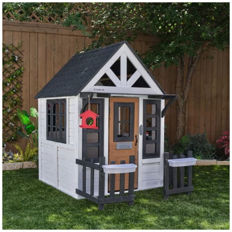 Transforme todos os dias no quintal em uma verdadeira experiência de férias com a Casa de Bonecas KidKraft Riverscape. Tanto as crianças quanto os pais vão adorar as vibrações relaxantes que emanam do jardim com cerca de piquete e alpendre. Feita de madeira, esta chalé pitoresca vai inspirá-lo a carregar os sacos de dormir e se mudar, pelo menos por um dia. Cultive flores ou ervas nas caixas de plantio na frente. Recepcione os amigos emplumados na casinha de pássaros pendurada, enchendo-a com sementes. E convide animais de estimação reais ou não para entrar pela divertida porta de vinil. Os convidados podem tocar a campainha e se juntar à diversão. Lá dentro, você encontrará uma pia, queimador e utensílios para preparar uma refeição caseira. A parte de trás da casa de bonecas possui uma janela espaçosa aberta com toldo de tecido coberto, sendo um local perfeito para servir alimentos ou fazer um teatro de marionetes. Lousas aguardam por arte inspirada pela natureza. Cada momento passado nesta adorável casa de bonecas deve ser celebrado. Decore-a com balões ou outras decorações para combinar com as estações do ano, tornando-a um espaço de entretenimento durante todo o ano. Com uma construção durável, telhado de plástico de manutenção fácil e mancha à prova de intempéries, haverá muitas excursões à Casa de Bonecas Riverscape no futuro.