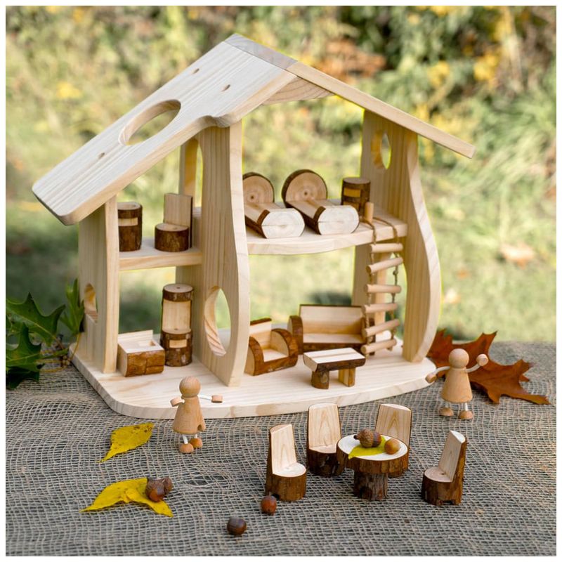 O conjunto inclui a casa de bonecas totalmente montada, móveis em miniatura com acabamento que remete à casca de árvore e figuras de pessoas, favorecendo o uso de elementos naturais adicionais (não incluídos) durante as atividades. Dimensionada para crianças a partir de 3 anos, apoia a exploração de narrativas, organização espacial e interação social em contextos domésticos e educacionais.