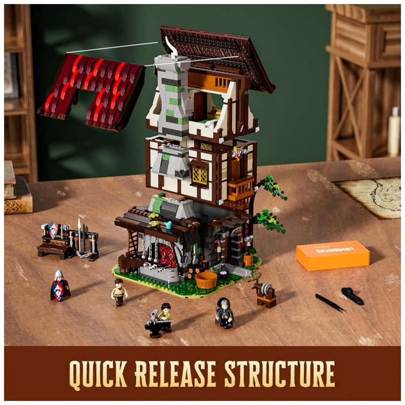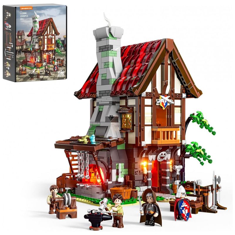 Conjunto de blocos de montar em plástico que representa uma casa de forja medieval com oficina de ferreiro integrada e área residencial em múltiplos andares. A estrutura inclui grande fornalha conectada a chaminé alta, área de oficina no térreo com ferramentas e armas modeladas, além de pavimentos superiores com espaços de estar e dormitórios em estilo medieval.