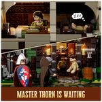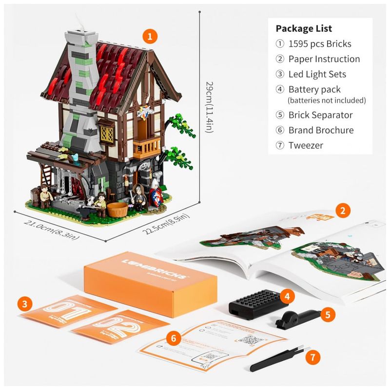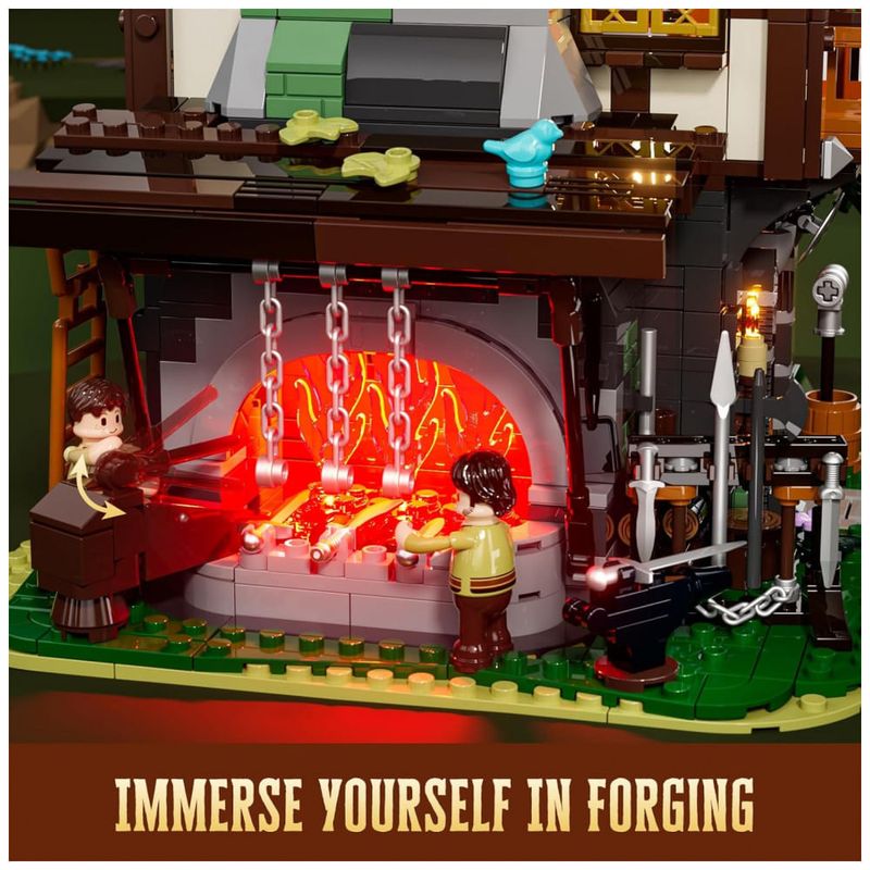O sistema de iluminação dedicado utiliza fios de LED com múltiplos pontos de luz distribuídos entre fornalha, tochas, lamparinas e velas, criando efeito de brilho intenso na área da forja e iluminação quente nas áreas internas. A combinação de luzes e detalhes internos valoriza o ambiente de trabalho do ferreiro, os espaços de convivência e os elementos decorativos medievais.