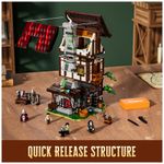 O design arquitetônico utiliza telhados inclinados, paredes em pedra e tijolo, vigas de madeira aparentes e contraste entre telhas vermelhas e paredes em tons de cinza, reforçando o visual típico da época. Os três andares podem ser removidos em seções para facilitar o acesso aos ambientes internos e a exposição em coleções temáticas.