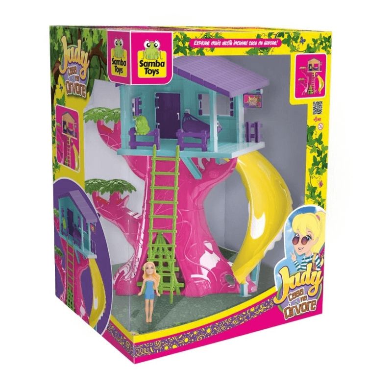 Contém: 01 Casa na árvore 01 Escada 01 Balanço 01 Escorrega 01 Boneca E 01 Pet