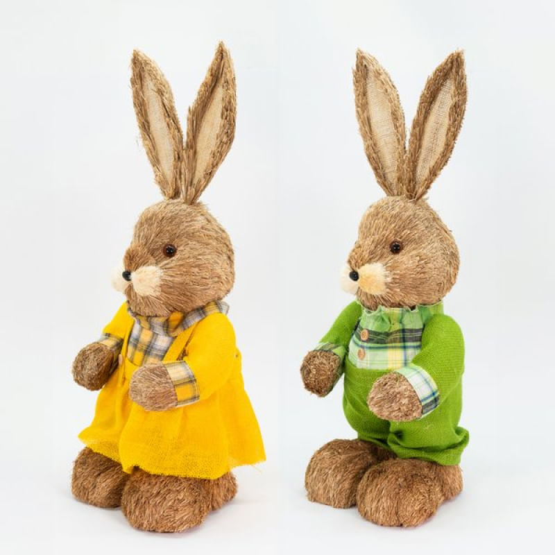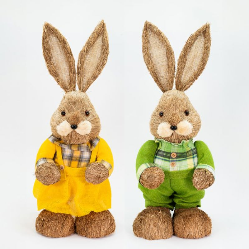 Casal De Coelhos Páscoa Decoração em Palha Coelhinhos Coloridos 60cm -