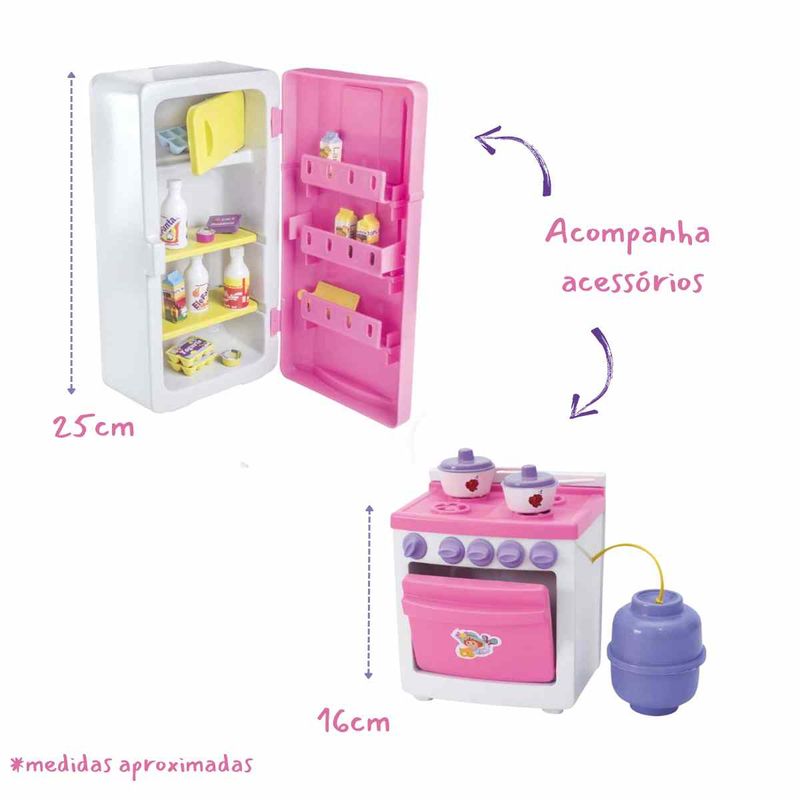 Conteúdo da Embalagem: 1 Geladeira, 1 Fogão, 1 botijão, 14 acessórios