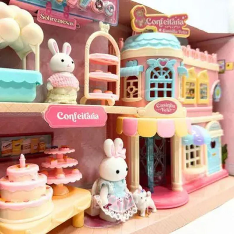 Prepare-se para abrir as portas de um mundo cheio de doçura com a Casinha Feliz Confeitaria. Este cenário completo e espaçoso estimula a imaginação das crianças, permitindo a criação de histórias divertidas e cheias de sabor. A confeitaria conta com loja em formato temático, balcão, vitrine, mesa com bolo e diversas sobremesas em miniatura, como cupcakes e doces, além de dois bonequinhos articulados prontos para atender os clientes.