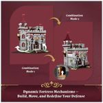 Configuração modular: Conexão entre torre e bloco principal por pinos, permitindo layout linear ou em L, com pontos de expansão para outros conjuntos medievais Lumibricks??