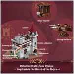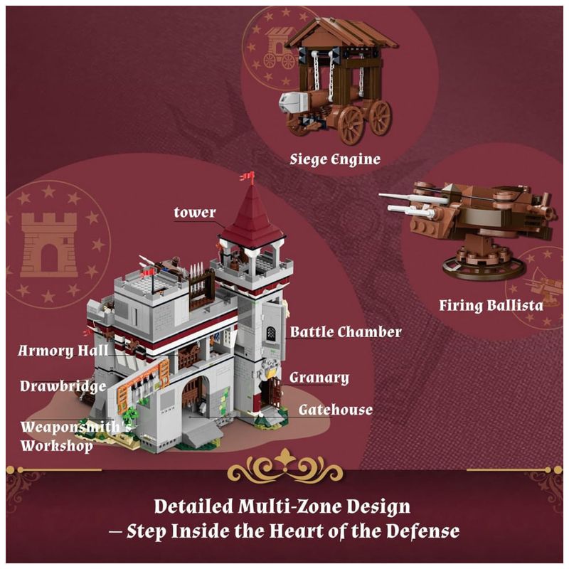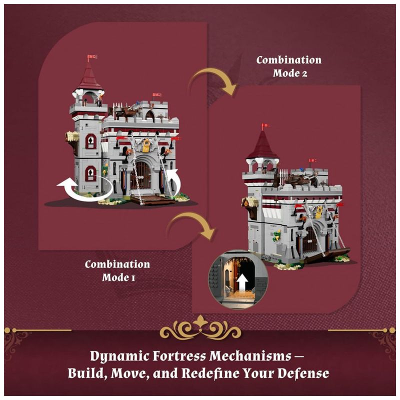O modelo incorpora mecanismos funcionais, como ponte levadiça, portão interno móvel, parede traseira articulada na sala de armas, balista giratória e aríete móvel para simulação de defesa de castelo. A base possui pontos de conexão preparados para integração com outros conjuntos medievais da mesma linha, permitindo expansão de dioramas.??