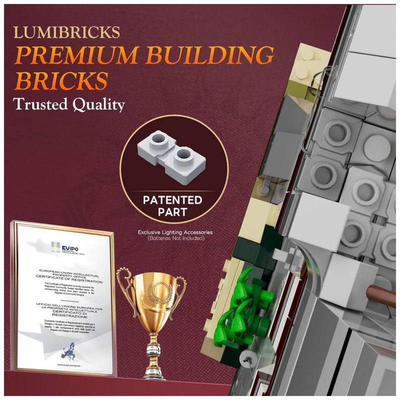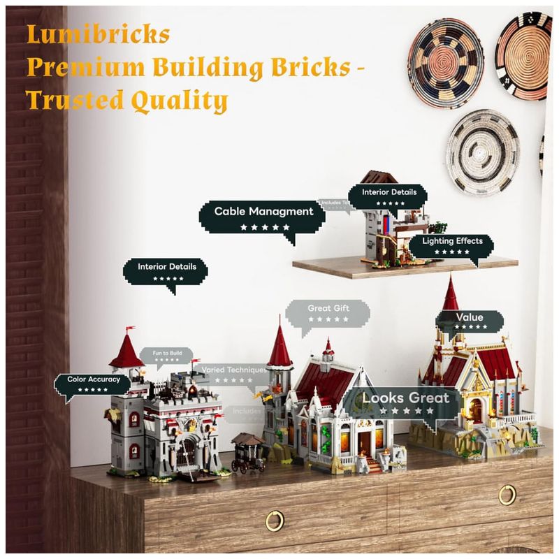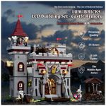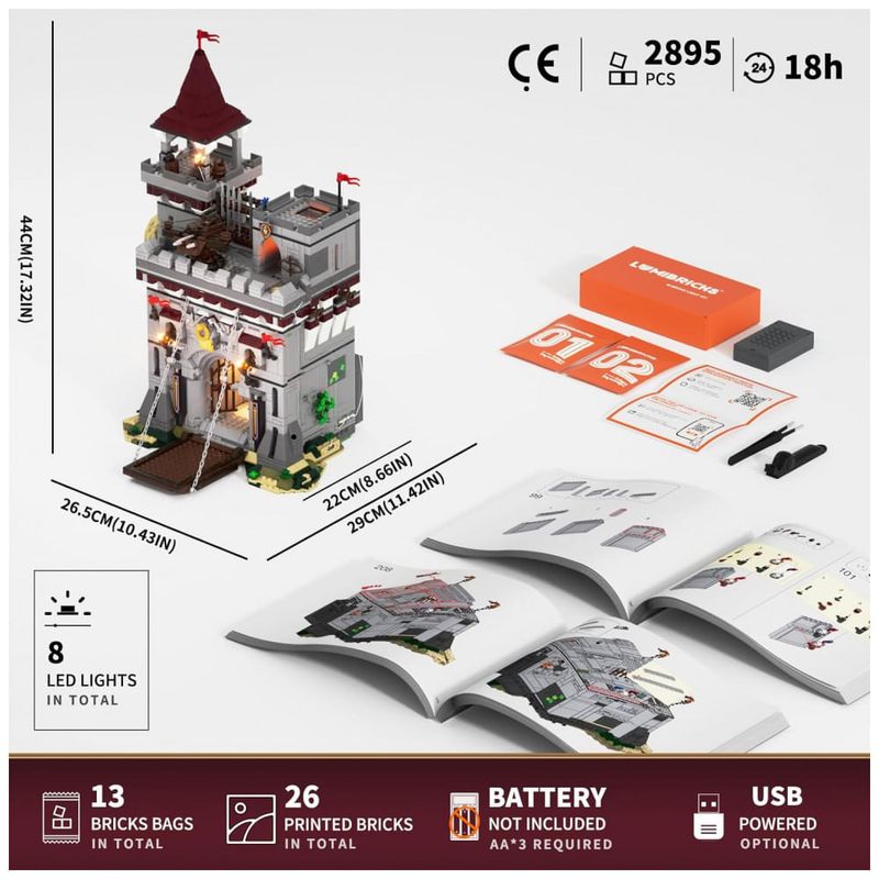 O sistema de iluminação utiliza LEDs distribuídos em fachadas, tochas e áreas internas, com módulos de energia embutidos na construção para realce da estrutura em exibição noturna. O kit acompanha minifiguras temáticas com diferentes funções, além de peças impressas com brasões, mapas e padrões de pedra.??