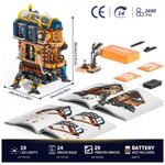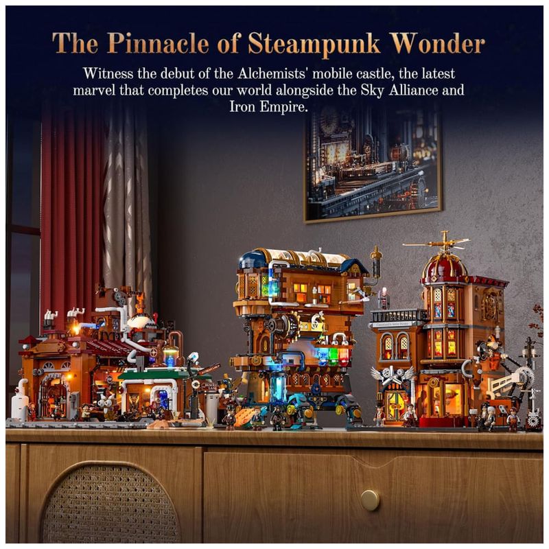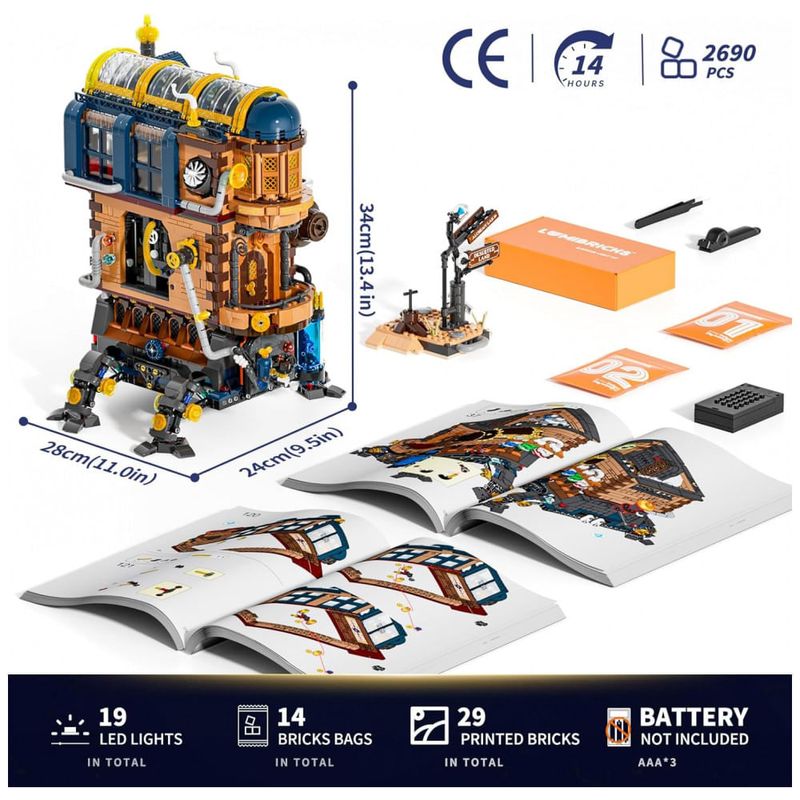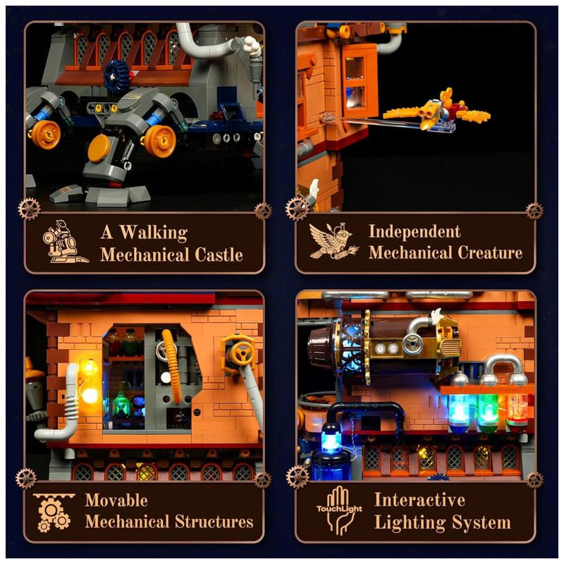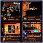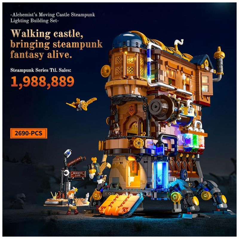 O kit Lumibricks Castelo Móvel Mecha-Alquimista contém 2690 peças plásticas ABS que formam laboratório ambulante steampunk com trem interno de engrenagens e sistema de simulação de servo, movimentado por pernas mecânicas multi-articuladas com ritmos realistas, criando animação funcional de arquitetura móvel.