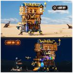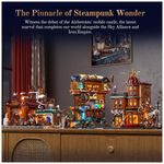 O diorama interno abriga guardião mecânico, frascos de poções multicoloridas luminescentes, ovo de ave incubando e placa de sinalização removível, ampliando possibilidades de storytelling. Como conjunto principal da facção Alquimista, expande universo steampunk Lumibricks compatível com Sky Alliance e Iron Empire.