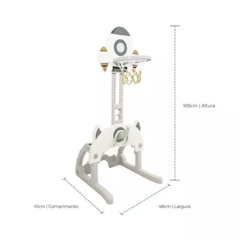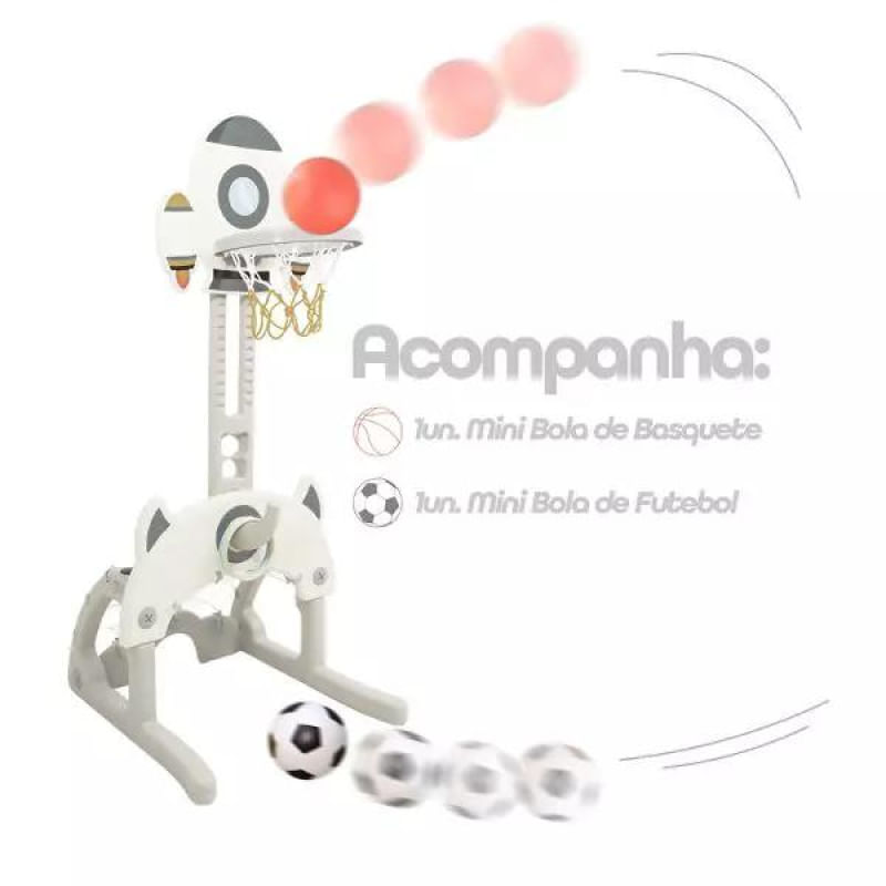 Composto por uma cesta de basquete com altura ajustável, um golzinho e um jogo de argolas, oferece diferentes formas de brincar e aprender enquanto se movimenta. Acompanha duas bolinhas (uma de futebol e uma de basquete) e quatro argolas coloridas, prontas para a diversão começar.