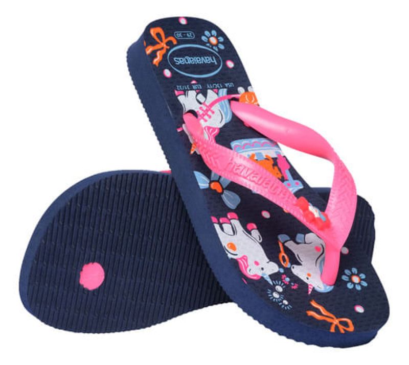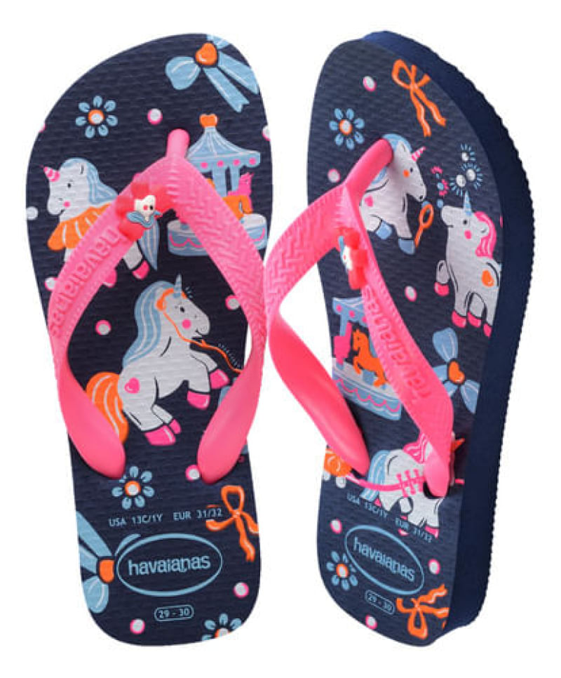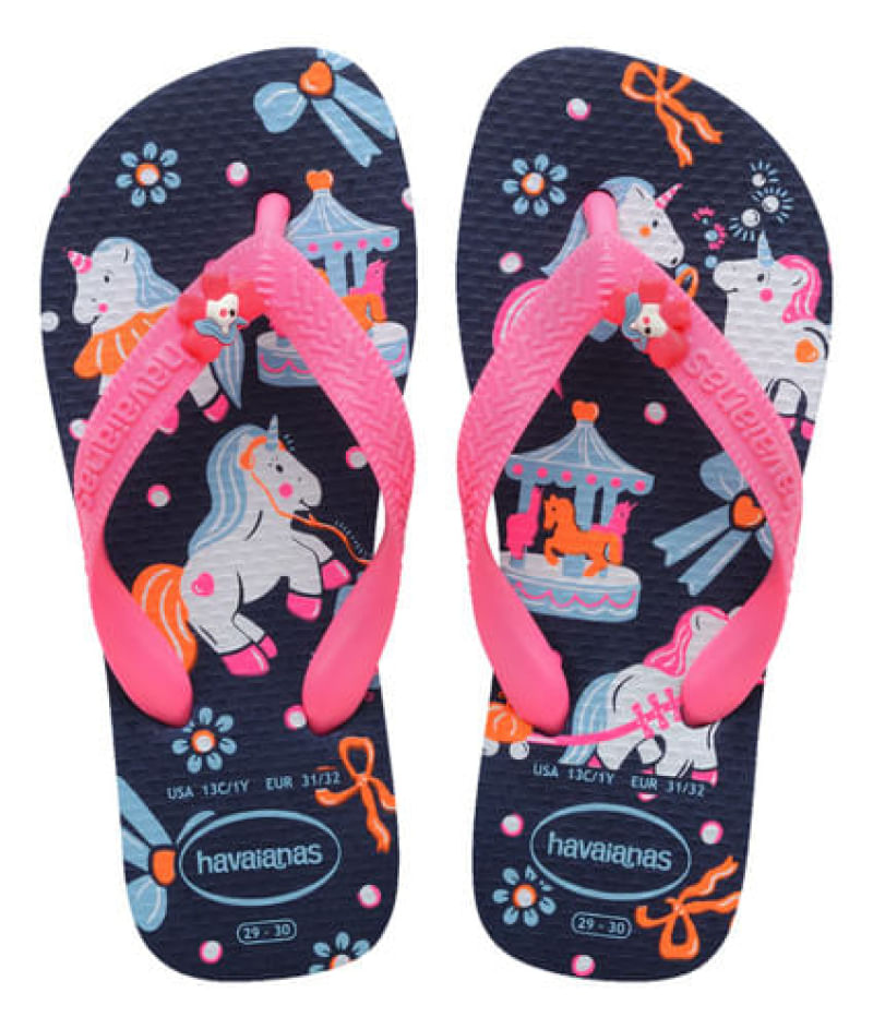 O chinelo Havaianas Kids Fantasy Unicórnio é confeccionado em material emborrachado, com cabedal na cor rosa que contém aplicação em relevo com o nome da marca e um pin super fofo de unicórnio, com solado antiderrapante e entressola com absorção de impacto. O formato do calçado proporciona o calce perfeito. A estampa com tema unicorn é sucesso!!