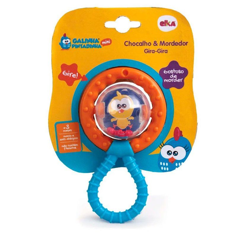 Ficha Técnica:Marca: Elka;Nome do produto: Chocalho e Mordedor Gira Gira Galinha Pintadinha Mini;Idade Recomendada: A partir de 3 meses;Selo Inmetro: CE-BRI/IQB-2276 - NM 300/2002 - OCP 0006;Composição: Plástico, PVC, Tinta atóxica, Adesivo e Vinil;Contém: 1 Chocalho mordedor.