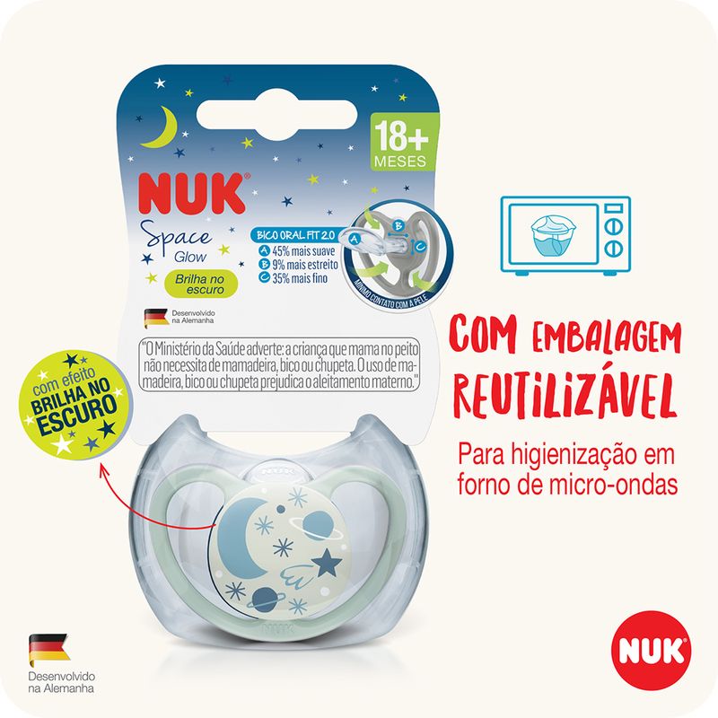 A Chupeta Space Glow de Silicone S3 Neutro é fabricada pela marca NUK. O tamanho 3 é indicado para bebês acima de 18 meses e proporciona o mínimo contato com a pele do pequeno.