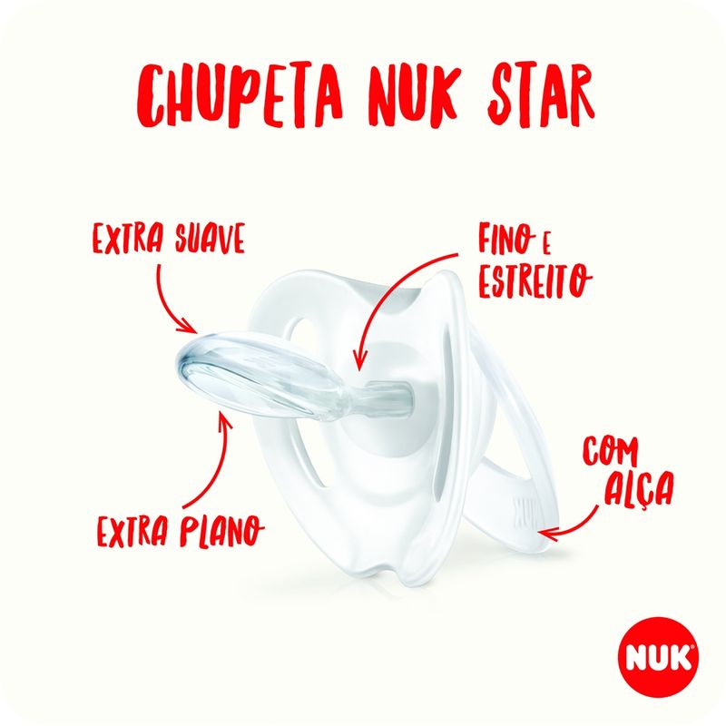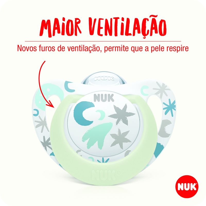 Exclusiva e única a Chupeta NUK Star Glow possui formato que contorna o rosto do bebê de maneira suave sem cobrir o nariz do pequeno facilitando sua respiração. Seu bico em silicone possui formato assimétrico NUK Oral Fit 2.0, ou seja, 35% mais fino e 45% mais suave, além de ser mais macio e estreito. Se encaixa perfeitamente na boca proporcionando maior conforto nos movimentos naturais de sucção em cada fase do crescimento do bebê. A chupeta NUK Star Glow possui furos de ventilação com novo design para permitir maior circulação de ar e proteger a pele sensível da criança. Sua argola brilha no escuro podendo ser encontrada rapidamente, sem precisar acender a luz durante a noite. Sua tecnologia "brilha no escuro" não é tóxica e não faz mal a saúde da criança, o modelo é ideal para anexar o prendedor de chupeta, além disso, a criança pode utilizar a argola para coçar a gengiva e aliviar o desconforto do nascimento dos primeiros dentinhos. A chupeta é livre de BPA. Recomendado para crianças de 0 a 6 meses.