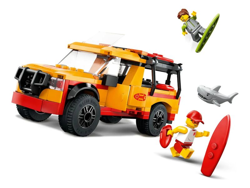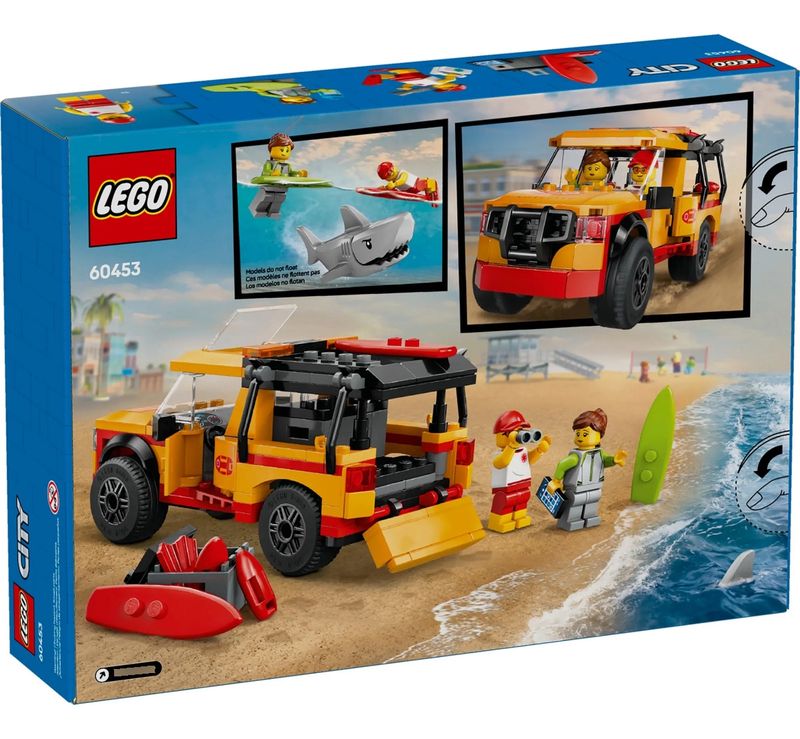 As aventuras de resgate na praia estão no horizonte com o conjunto de brinquedos LEGO® City Lifeguard Beach Rescue Truck (60453) para crianças de 6 anos ou mais. Este caminhão de brinquedo legal com portas que abrem, porta traseira e teto solar vem com itens essenciais para emergências na praia, incluindo 2 pranchas de surfe, nadadeiras, binóculos e um kit de primeiros socorros. O conjunto também inclui minifiguras de salva-vidas e surfistas e uma figura de tubarão para brincadeiras imaginativas e contação de histórias.