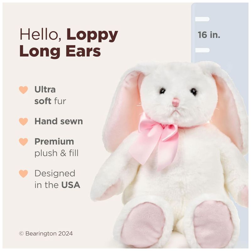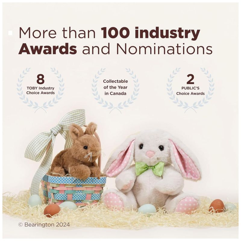 A Bearington é conhecida por sua excelência global em brinquedos de pelúcia, incluindo este coelho de pelúcia que é um exemplo de luxo personalizado e máxima qualidade.