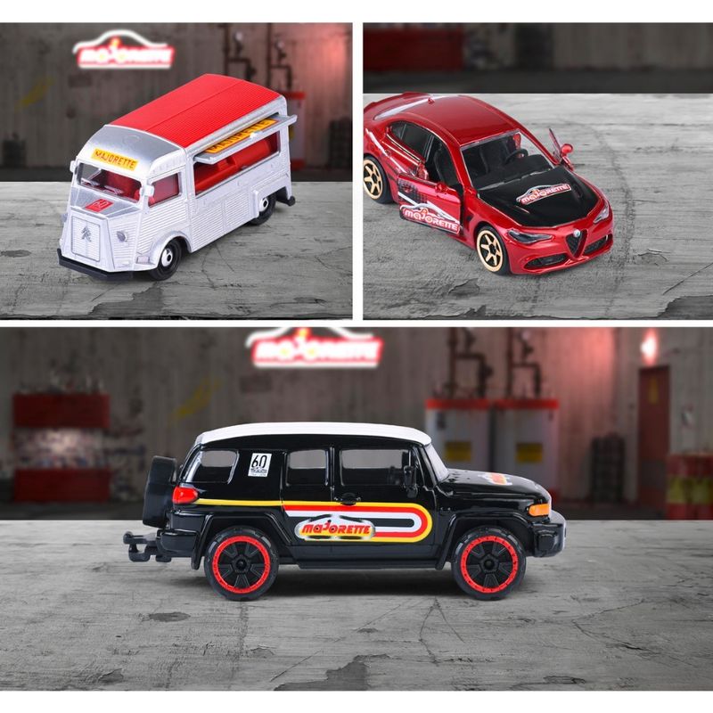 Coleção c/ 6 Miniaturas Edição AniversárioMarca do produto: MajoretteColeção: Anniversary Edition - 1964 - 2024 - 60 Years MajoretteEscala: 1/64 (de 7,5 a 8 cm de comprimento)Miniatura em Metal Fundido (Die-Cast) com partes de plástico.Carros com roda livre.Alguns Veículos possuem partes móveis (abrem a porta ou tampa da caçamba)Miniaturas desta coleção:1 - Chevrolet Corvette ZR-12 - Toyota FJ-Cruiser3 - Mercedes-Benz 450 SEL4 - Alfa Romeo Giulia Quadrifoglio5 - Citroën HY6 - Volvo 240 GL Estate