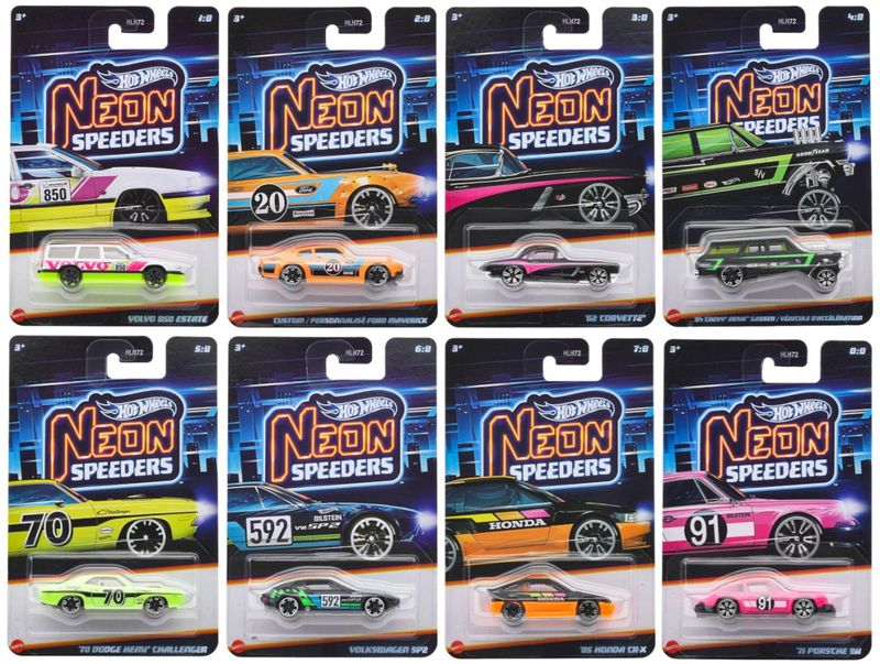 Coleção Completa c/ 8 Miniaturas Série Neon Speeders Mix F Marca do produto: Hot Wheels - Mattel. Coleção: Neon Speeders Miniaturas da coleção: #1 - Volvo 850 Estate #2 - Custom Ford Maverick #3 - ? Corvette #4 - ? Chevy Nova Gasser #5 - ? Dodge Hemi Challenger #6 - Volkswagen SP2 #7 - ? Honda CR-X #8 - ? Porsche 911 Escala: 1/64 (7 cm de comprimento)