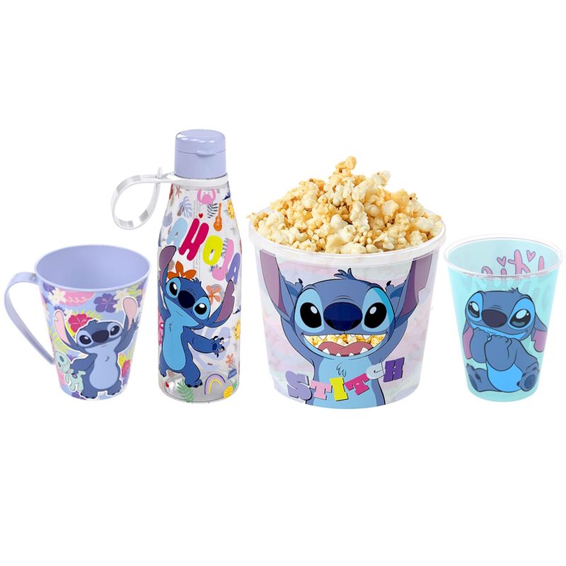 Coleção Stitch 4 em 1 Pote Balde de Pipocas 1,2L, Garrafa 530ml, Caneca 360ml e Copo 280ml Plasútil Original
