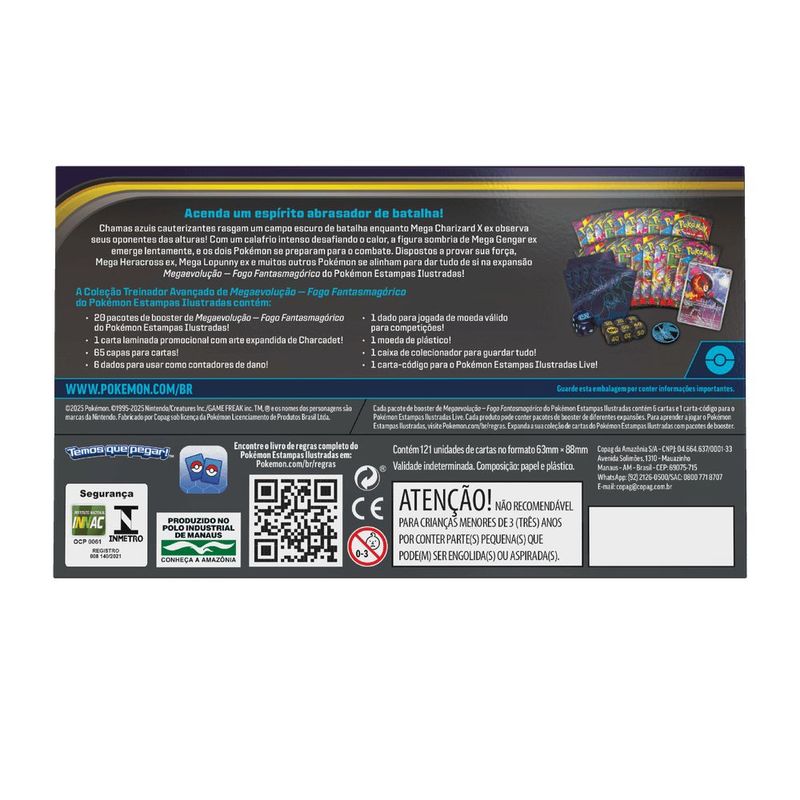 Coleção Treinador Avançado Mega Evolução Fogo Fantasmagórico ME02 Marca do produto: Copag. Coleção: Megaevolução - ME02 Conteúdo: - 20 pacotes de booster de Megaevolução - Fogo Fantasmagórico do Pokémon Estampas Ilustradas! - 1 carta laminada promocional com arte expandida de Charcadet! - 65 capas para cartas! - 6 dados para usar como contadores de dano! - 1 dado para jogada de moeda válido para competições! - 1 moeda de plástico! - 1 caixa de colecionador para guardar tudo! - 1 carta codificada para o Pokémon Estampas Ilustradas Live. Acenda um espírito abrasador de batalha! Chamas Azuis cauterizantes rasgam um campo escuro de batalha enquanto Mega Charizard X ex observa seus oponentes das alturas! Com um calafrio intenso desafiando o calor, a figura sombria de Mega Gengar ex emerge lentamente, e os dois Pokémon se preparam para o combate. Dispostos a provar sua força, Mega Heracross ex, Mega Lopunny ex e muitos outros Pokémon se alinham para dartudo de si na expansão Megaevolução — Fogo Fantasmagórico do Pokémon Estampas Ilustradas Item lacrado de fábrica. Idioma: Português Brasileiro