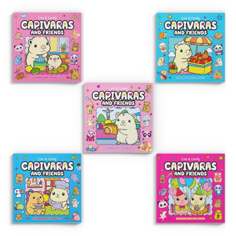 Inspirado na tendência que bombou no TikTok, este kit reúne 5 exemplares do livro de colorir mais fofo do momento, cada um com 32 ilustrações exclusivas de capivaras carismáticas e seus amigos em cenários aconchegantes — todos prontos para ganhar vida com seus lápis de cor ou marcadores favoritos.