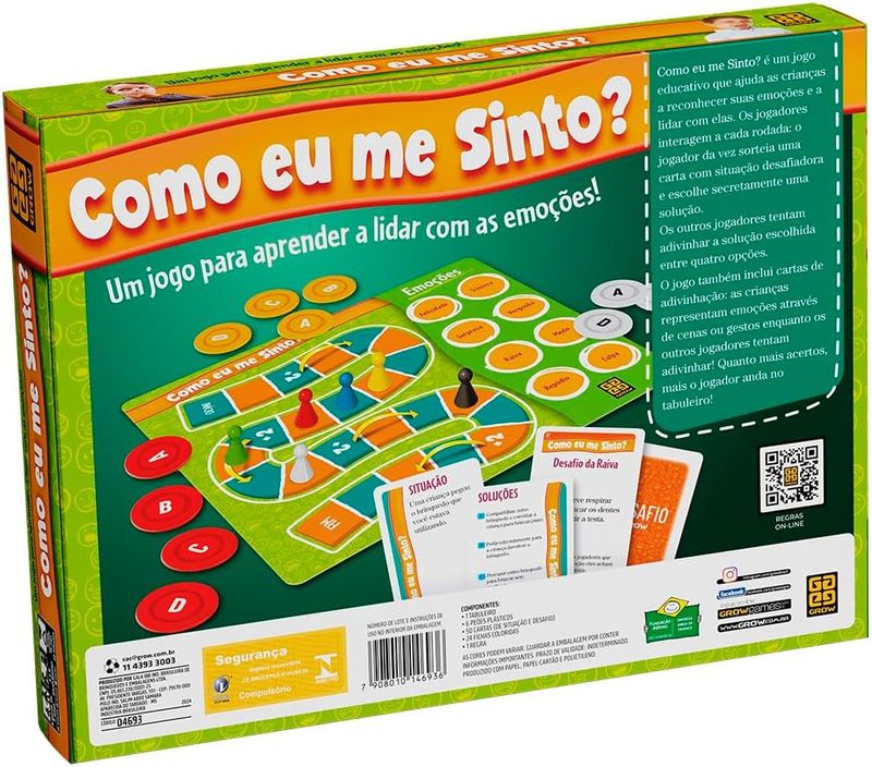 Como Eu Me Sinto? é um jogo educativo que vai ajudar as crianças a reconhecerem e lidar com suas emoções de uma maneira divertida e interativa. Ideal para momentos de aprendizado e diversão em família, o jogo incentiva o desenvolvimento emocional e a comunicação. No jogo existem cartas com situações nas quais os jogadores tentam acertar a melhor solução entre as opções disponíveis,