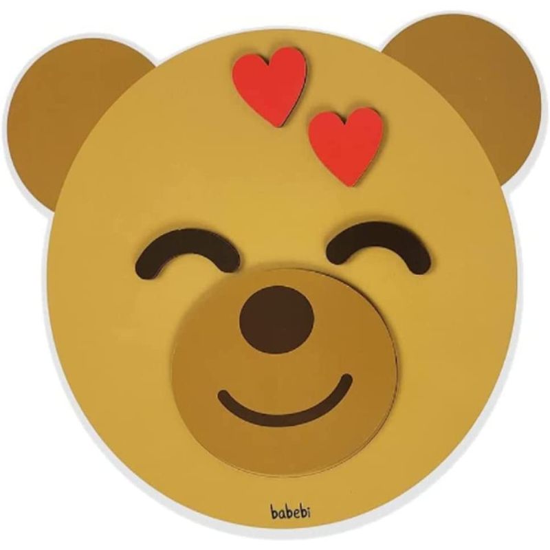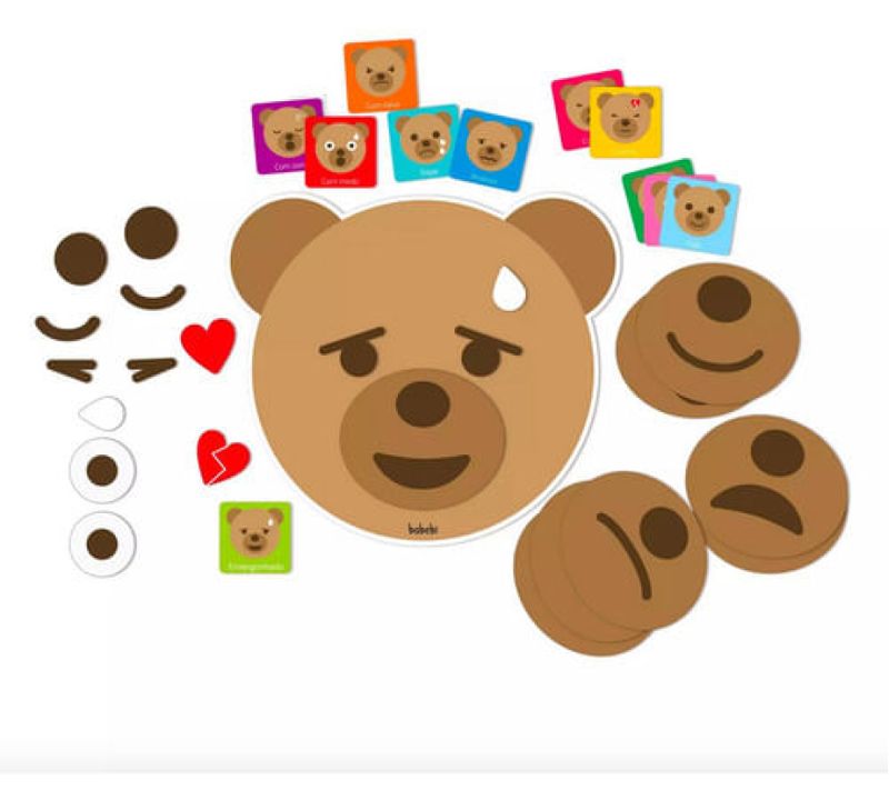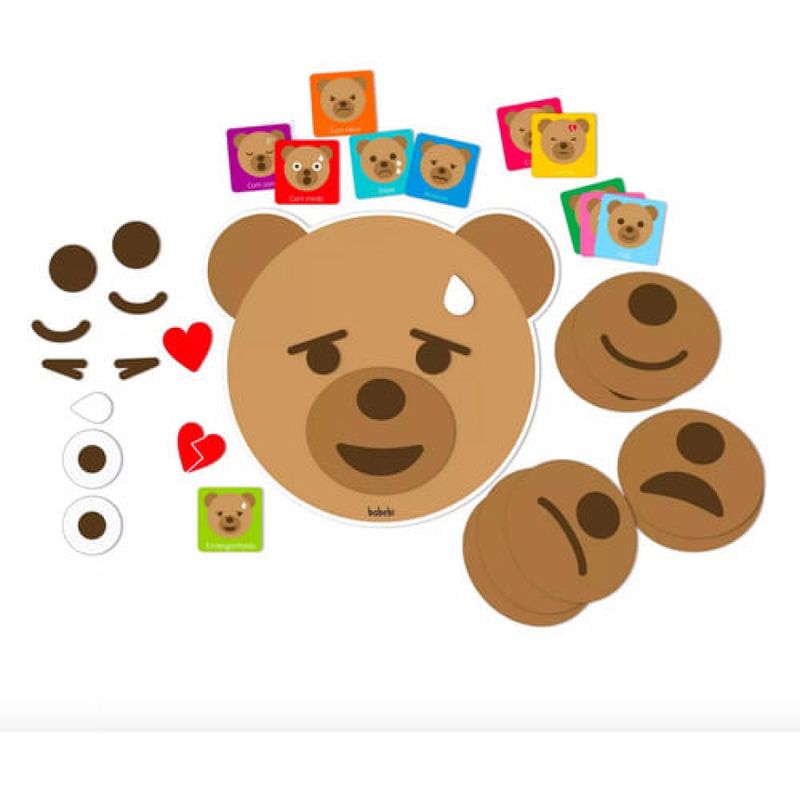 feito de Madeira Reflorestada. Contém 1 Tabuleiro em Formato de Ursinho (26 X 23cm), 24 Peças (expressões) e 12 Fichas com Sentimentos. Materiais Seguros, Duráveis e Ecológicos.