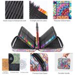 O estojo em tecido Oxford possui compartimentos internos em múltiplas camadas com 126 encaixes individuais para lápis e acessórios, alça de transporte, bolso frontal e zíper duplo. A organização interna permite distribuir os lápis por grupos de cor, mantendo o conjunto adequado para transporte e uso em viagens, cursos e ateliês.