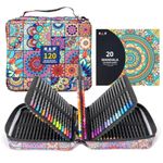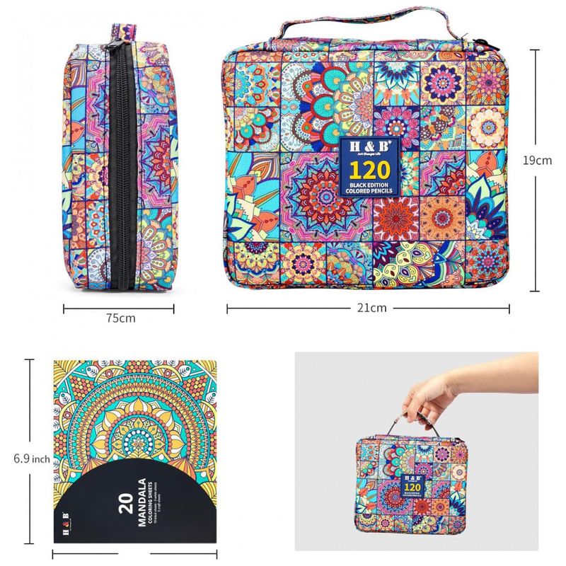 Este conjunto H & B Black Wood reúne 120 lápis de cor com corpo em madeira preta e minas macias à base de óleo, acompanhado de livro para colorir com papel preto, borracha, apontador e estojo com estampa mandala. As minas oferecem aplicação suave, pigmentação rica e boa resistência à luz, adequadas para camadas, mesclas e detalhes em papéis claros e escuros.