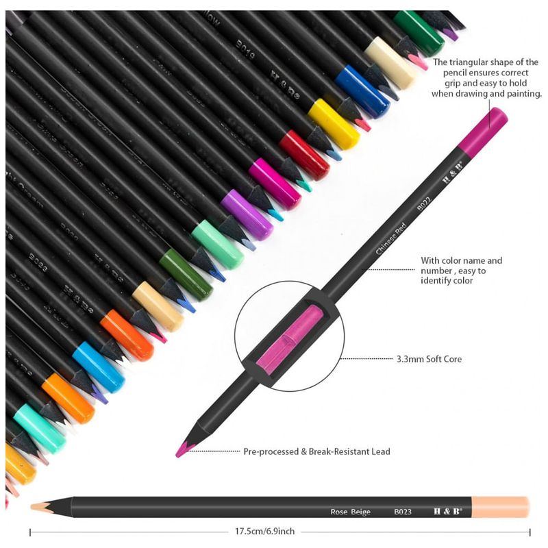 Os lápis são pré-apontados e produzidos em madeira basswood, garantindo boa durabilidade do corpo e conforto no manuseio. Cada lápis recebe impressão do nome e número da cor, além de codificação visual, facilitando a identificação rápida durante o uso.