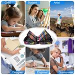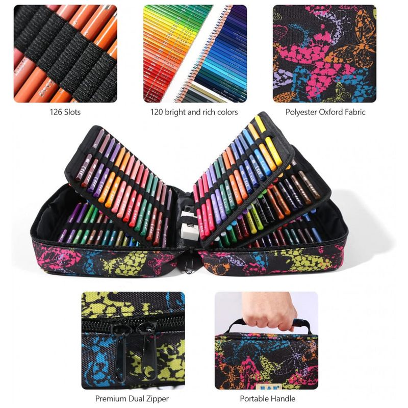 Todos os itens são organizados em estojo com fechamento em zíper e estrutura interna em camadas, permitindo separar lápis por grupos de cor. A embalagem facilita o transporte e o acesso aos lápis, atendendo usuários iniciantes e experientes em atividades de desenho e coloração.