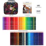 A paleta inclui 120 cores com pigmentação intensa para preenchimento, sombreamento, mistura e criação de gradientes em papéis de desenho e livros de colorir. Cada lápis é identificado com nome, número e informação de resistência à luz, facilitando seleção de cores e repetição de combinações em diferentes projetos.