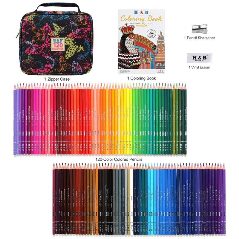 Este conjunto H & B reúne 120 lápis de cor com minas à base de óleo, acompanhados de borracha, apontador e livro para colorir, indicado para uso adulto em desenho e coloração. As minas foram formuladas para equilíbrio entre maciez e firmeza, oferecendo traço suave e boa resistência à quebra.