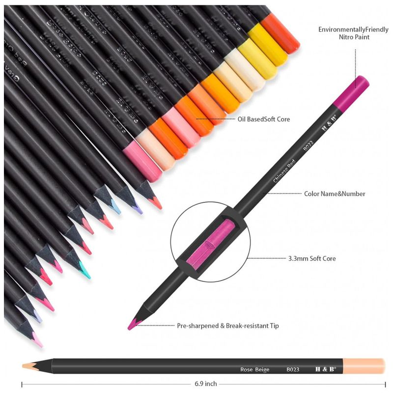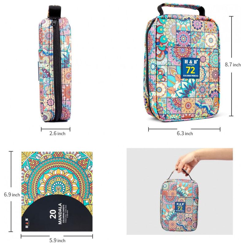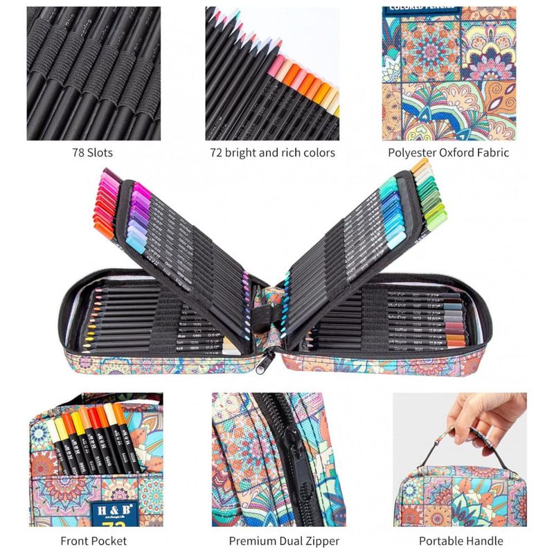 Este conjunto H & B reúne 72 lápis de cor com minas macias à base de óleo em um estojo mandala com múltiplos compartimentos, acompanhado de livro para colorir, borracha e apontador. As minas foram desenvolvidas para aplicação suave, boa cobertura e resistência à luz, adequadas para camadas, sombreamento, detalhes e mistura de cores.