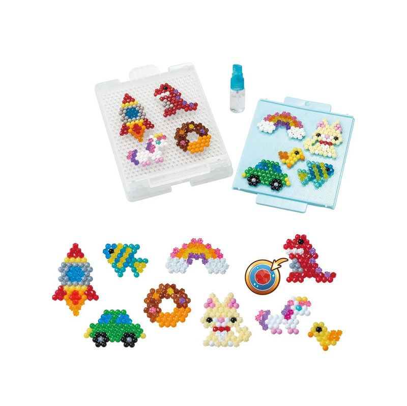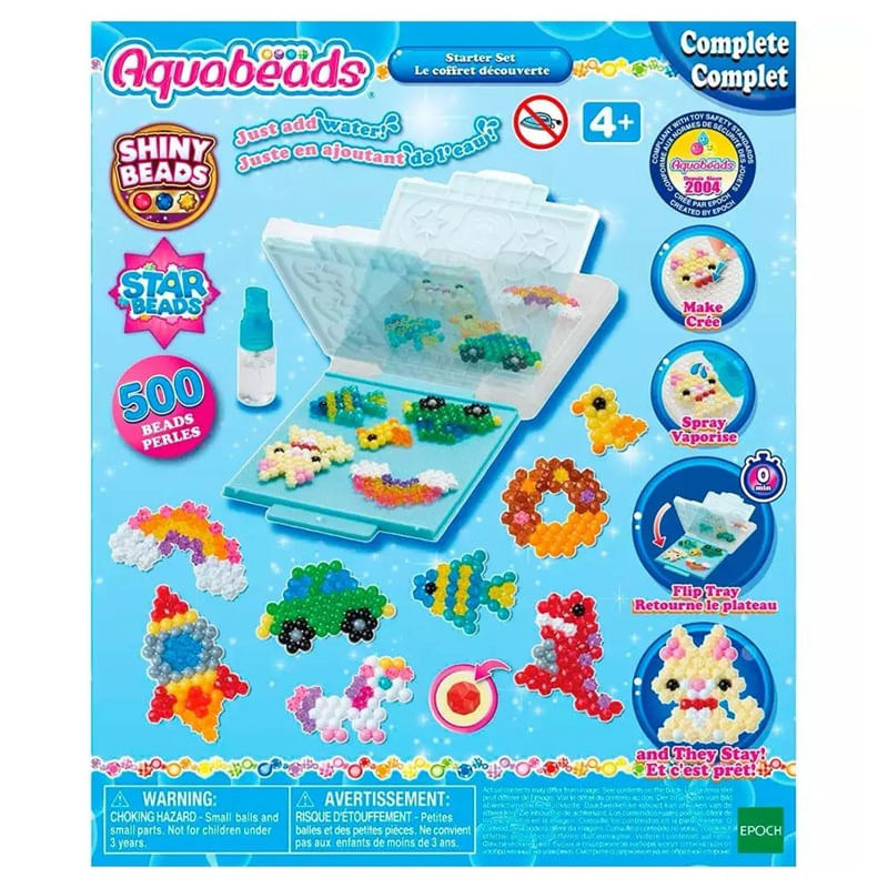 Inclui 500 contas lisas, joias e estrelas em 18 cores, bandeja giratória, pulverizador, molde e instruções. Para crianças a partir de 4 anos. Aquabeads foi criado pela EPOCH COMPANY, LTD. em 2004 como o brinquedo original de contas "cola com água". Não é adequado para crianças menores de 3 anos devido às peças pequenas.