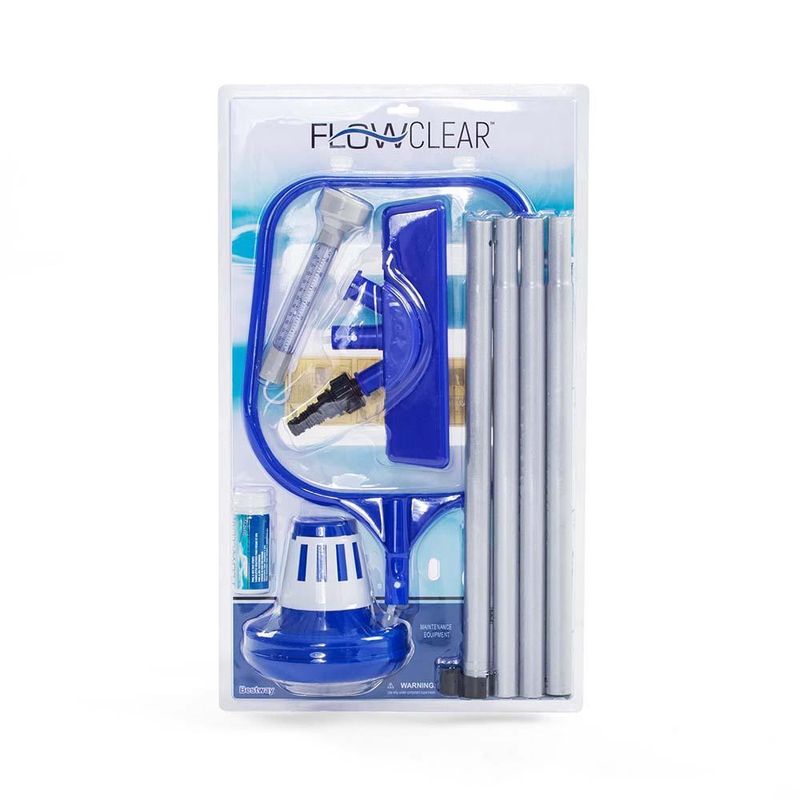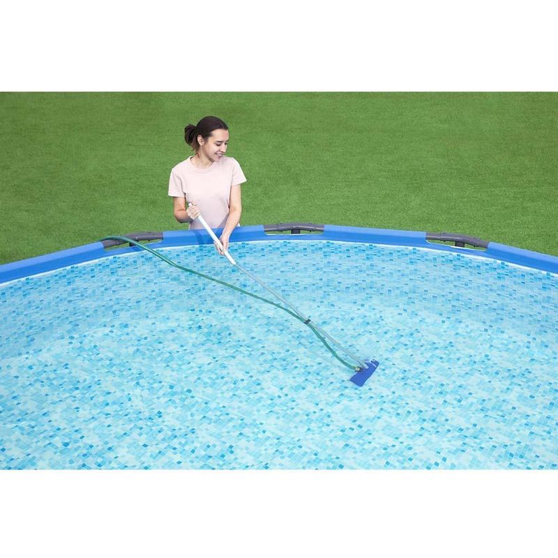 Com o conjunto completo de tratamento de piscina da Bestway® pode desfrutar de uma piscina limpa durante todo o Verão. Consiste num cabo de alumínio de 161 cm com acessórios de sucção e skimmer intercambiáveis, bóia dosadora, medidor de temperatura de natação, tiras de indicador de PH e remendos de reparação duráveis. Não são necessárias outras ferramentas. A sujidade do chão e das paredes é recolhida num recipiente fácil de esvaziar. O comprimento da pega é concebido para piscinas até 396 cm.Características: